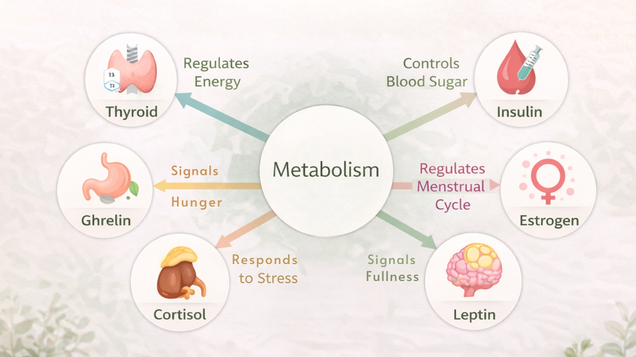 Hormonal balance plays a critical role in how efficiently your body burns energy. Metabolic hormones act like traffic controllers — when they’re in sync, metabolism runs smoothly. But when imbalanced, your body can slow down to protect itself.